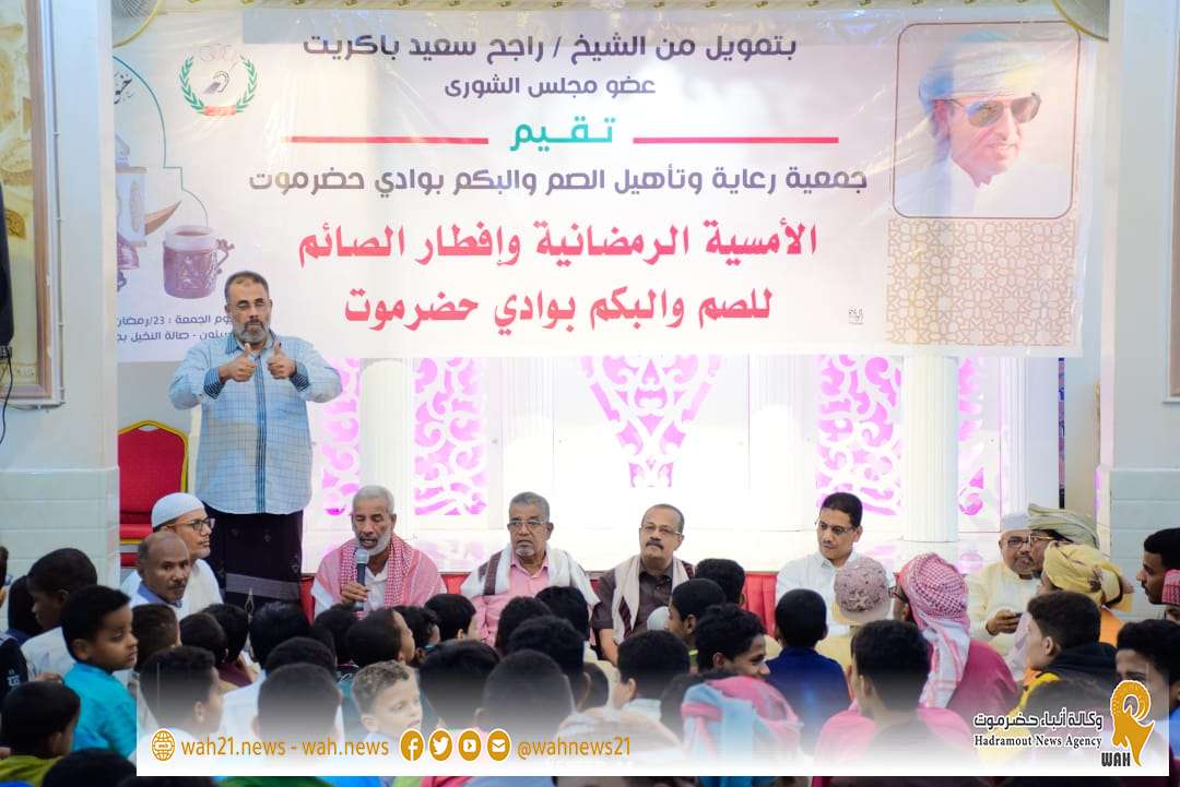 نظمت جمعية رعاية وتأهيل الصم والبكم بوادي حضرموت، اليوم السبت، أمسية رمضانية وإفطار الصائم، بتمويل من الشيخ راجح سعيد باكريت عضو مجلس الشورى.