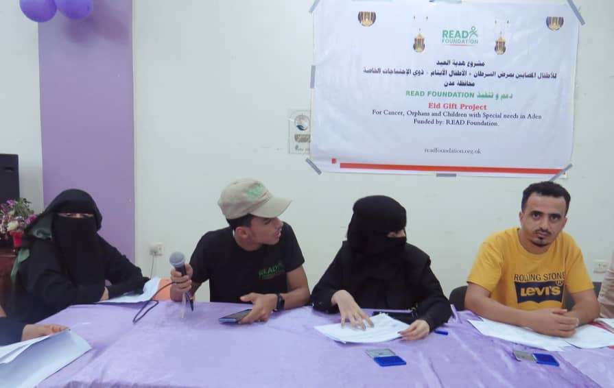 جرى مساء أمس توزيع هدايا عيدية في المجمع المهني لذوي الاحتياجات الخاصة في المنصورة بعدن، وذلك بدعم من منظمة اقرأ الدولية، ويأتي هذا المشروع كمنحة مقدمة للأطفال المصابين بمرض السرطان والأطفال الأيتام وذوي الاحتياجات الخاصة في العاصمة عدن.