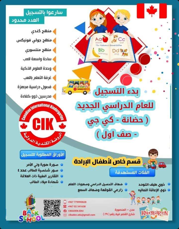 بدء التسجيل في الروضة الكندية الدولية للعام الدراسي الجديد بالعاصمة عدن