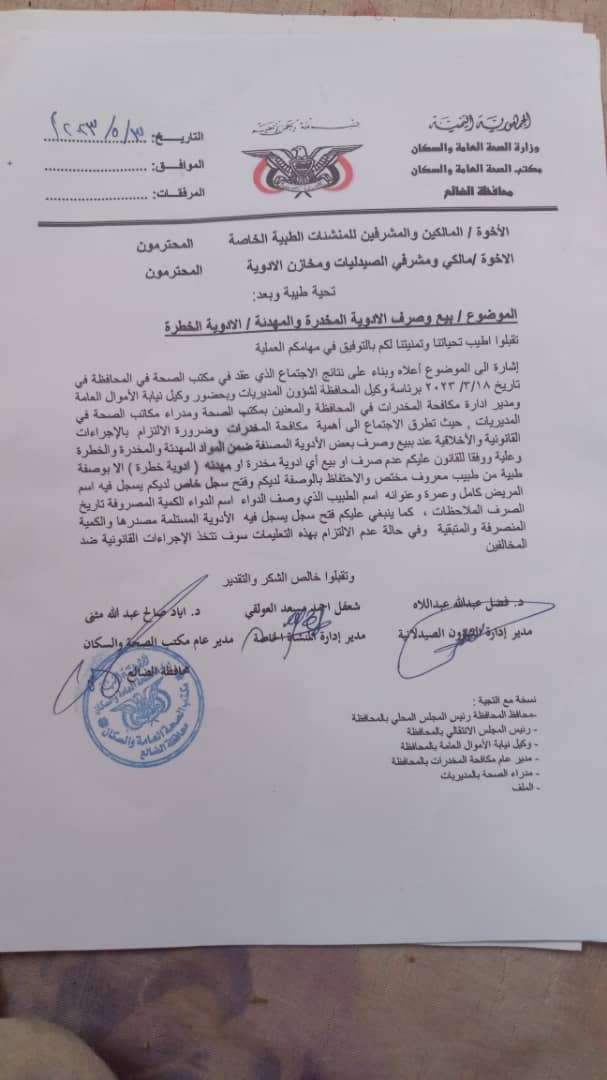 أصدر مكتب الصحه العامه والسكان محافظه الضالع  صباح اليوم الاربعاء  تعميماً لمالكي ومشرفي المنشئات الطبيه الخاصه والعامه من صيدليات ومسؤولي مخازن الادويه بالمحافظة والمديريات بعدم بيع الادويه المخدره والمهدئه اي "الادويه الخطره"