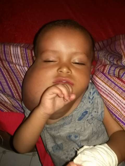الطفل " أمجد الحنشي " من مدينة زنجبار بأبين في عامه الثاني يعاني من ورم الغدة المنتفخة حتى صارت كالبالون في حلقة .