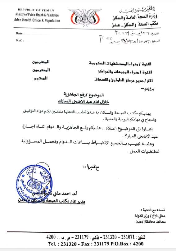 وجه مدير عام مكتب الصحة العامة والسكان بالعاصمة عدن أ.د.احمد مثنى البيشي صباح اليوم الاثنين كافة المستشفيات والمرافق الصحية ومركز الطوارئ والاسعاف بالمحافظة، برفع مستوى الجاهزية ،والاستعداد خلال فترة عيد الاضحى المبارك.