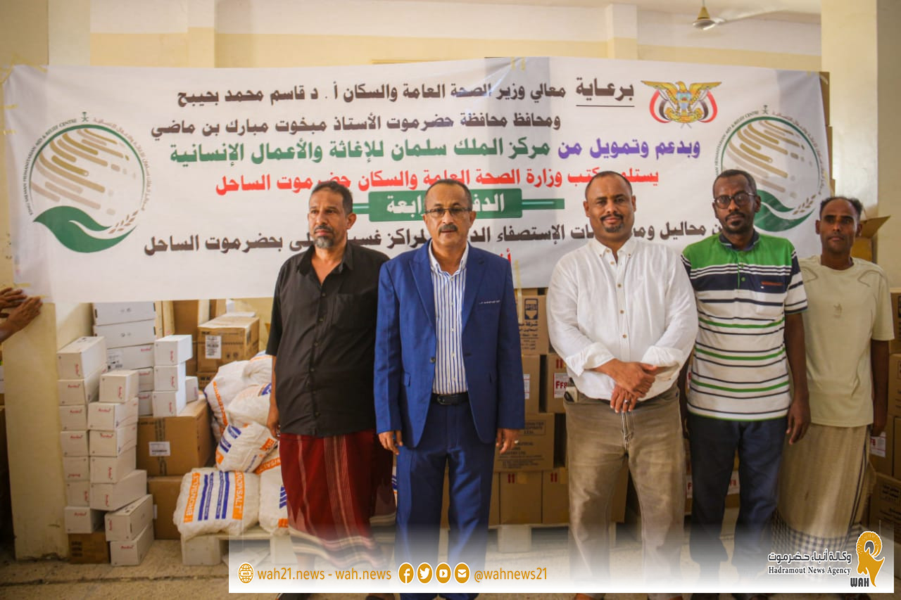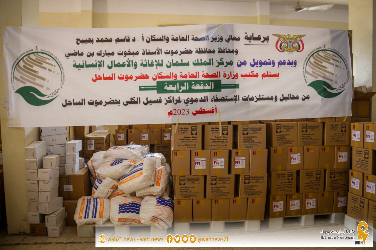دشن كل من المهندس أمين سعيد بارزيق وكيل محافظة حضرموت للشئون الفنية ، والدكتور محمد صالح الجمحي المدير العام لمكتب وزارة الصحة العامة والسكان بحضرموت الساحل ، بمحازن الدواء بمنطقة جول مسحة ، استلام شحنة كميات من المحاليل ومستلزمات الإستصفاء الدموي الدفعة الرابعة بدعم من مركز الملك سلمان للإغاثة والأعمال الإنسانية ، وذلك برعاية كريمة من معالي وزير الصحة العامة والسكان الأستاذ الدكتور قاسم محمد بحيبح و محافظ محافظة حضرموت الأستاذ مبخوت مبارك بن ماضي .