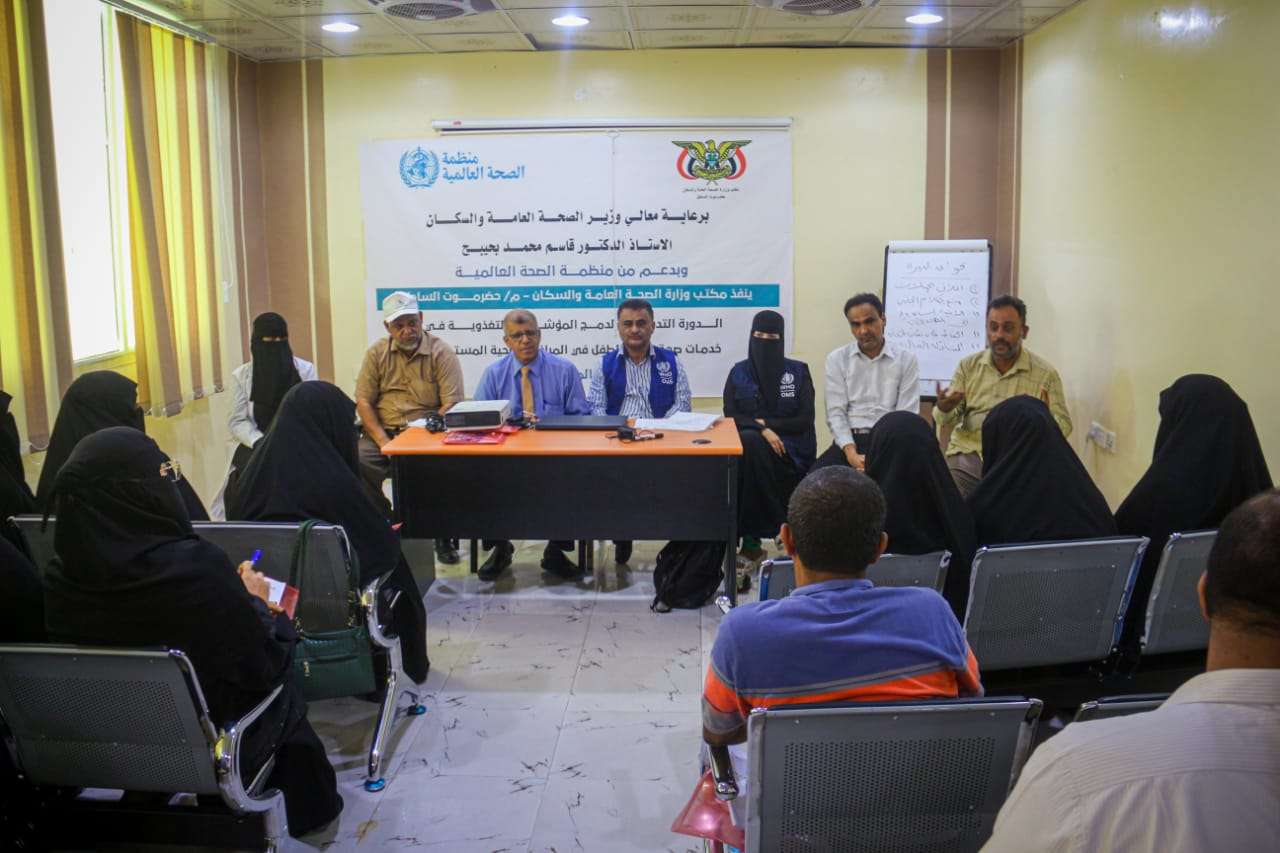 دشنت بقاعة التدريب بمستشفى المكلا للأمومة و الطفولة فعاليات الدورة التدريبية للعاملين الصحيين في مجال ,, دمج المؤشرات التغذوية في خدمات صحة الأم و الطفل في المرافق الصحية المستهدفة ,, بمديريتي الشحر و المكلا ، ينظمها مكتب وزارة الصحة العامة والسكان بحضرموت الساحل ، وبدعم من منظمة الصحة العالمية ، وذلك برعاية كريمة من معالي وزير الصحة العامة والسكان الأستاذ الدكتور قاسم محمد بحيبح .