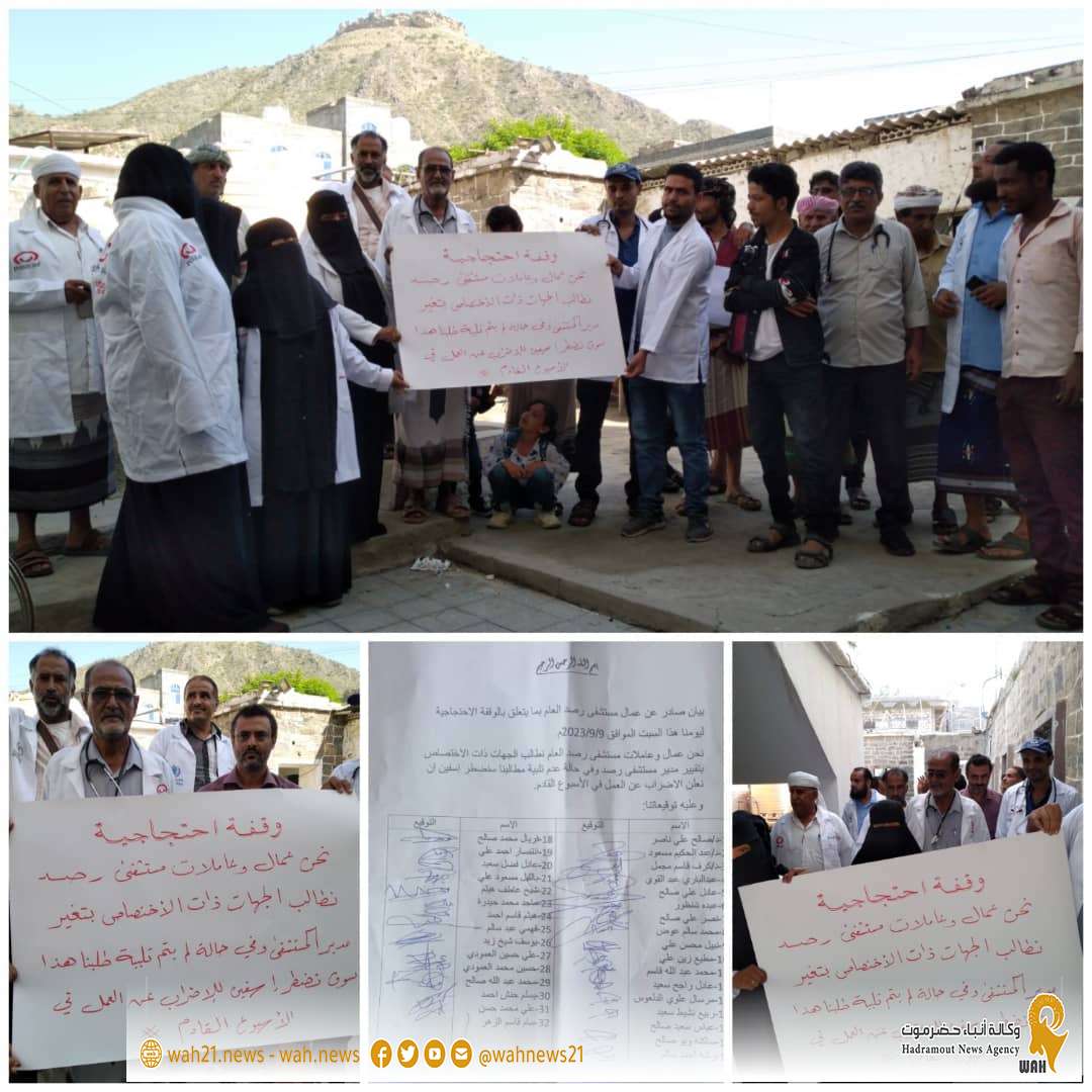 نظم عمال مستشفى رصد العام صباح يوم السبت 2023/9/9م وقفة احتجاجية ضد إدارة المستشفى طالبوا الجهات المعنية في المديرية والمحافظة تغيير مدير المستشفى نتيجة تدهور العمل وعدم تمكنه من احداث أي تحسن في الخدمات الطبية التي يقدمها المستشفى للمواطنين بل أن الخدمات الطبية أزدادت تدهوراً.