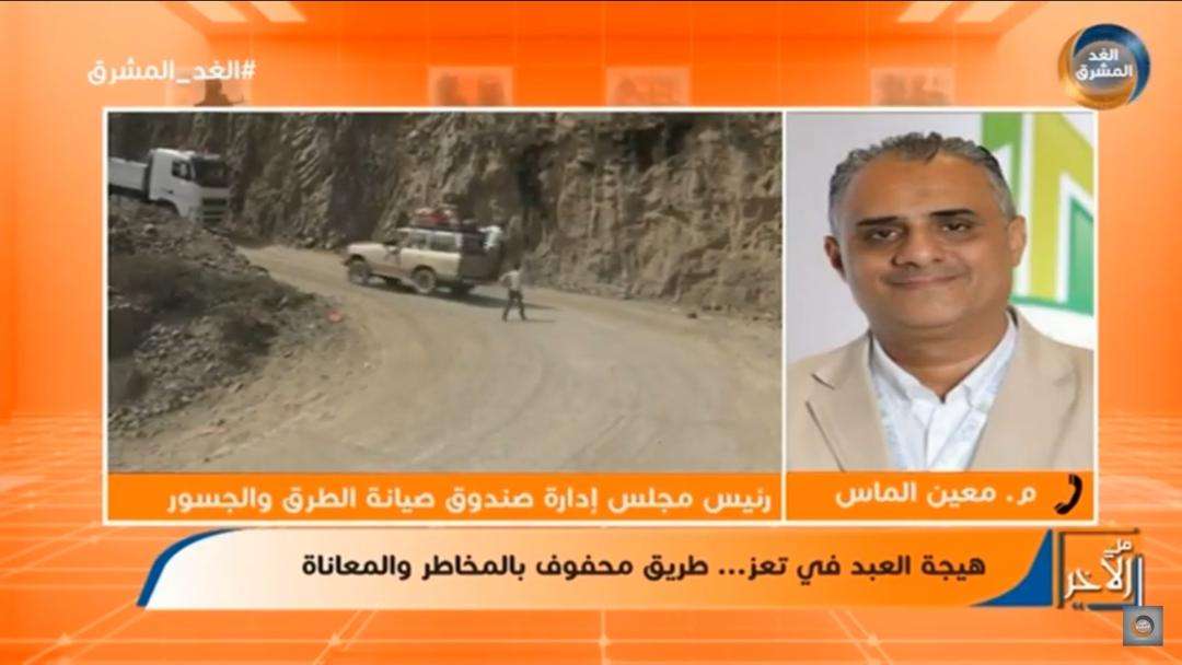 واستضاف البرنامج المهندس معين الماس رئيس مجلس إدارة صندوق صيانة الطرق والجسور ورد على جملة تساؤلات طرحها المذيع ، حيث أكد الماس في البدء على أهمية الطريق كونه المنفذ الوحيد لمديريات تعز الواقعة تحت سيطرة الحكومة الشرعية موضحا الصعوبات التي تقف في أن يصل الطريق إلى المستوى الذي يساهم في خدمة المواطنين ، مضيفا إن الطريق في الحقيقة لا يحتاج إلى صيانة لانه طريق ثانوي وبفعل الحرب صار طريق مستخدم لذا فهو يحتاج إلى إنشاء وليست صيانة ومهام الصندوق ليس الإنشاء بل الصيانة وخلال الفترات السابقة كانت هناك تدخلات ولكنها ليست معالجات وحلول لإنها كانت صيانة والطريق يحتاج انشاء ، وأوضح ان انشاء الطرق من مهام ومسؤوليات وزارة الاشغال العامة والطرق وصندوق الصيانة جزء منها لكن مهامه الصيانة .وأشار أن الكل يبذل قصارى جهده حسب الإمكانيات المتاحة وليس هناك قصور متعمد .