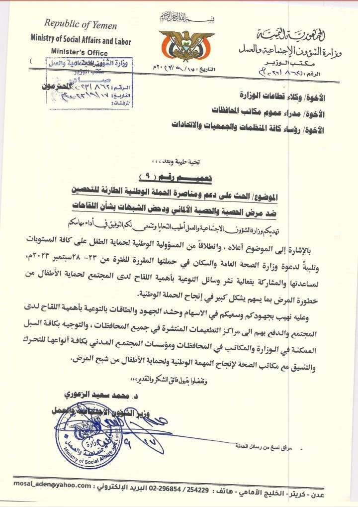 دعت وزارة الشؤون الاجتماهية والعمل بالعاصمة عدن كافة قطاعاتها ومديري مكاتبها في المحافظات الجنوبية والمناطق الحررة والمنظمات والجمعيات والاتحادات الى الإسهام وحشد الجهود والطاقات للمساعدة في انجاح الحملة الوطنية الطارئة لتحصين الاطفال ضد مرض الحصبة والحصبة الالماني.