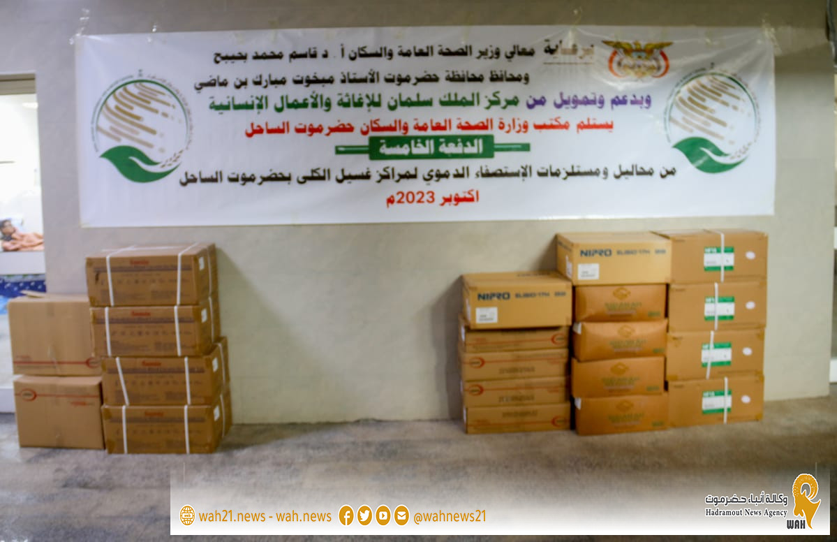 دشن كل من الأستاذ حسن سالم الجيلاني وكيل محافظة حضرموت والدكتور شوقي الشرجبي وكيل وزارة الصحة العامة والسكان لقطاع الطب العلاجي و الدكتور محمد صالح الجمحي المدير العام لمكتب وزارة الصحة العامة والسكان بحضرموت الساحل ، و الدكتور أحمد العسكري مدير مركز الغسيل الكلوي بحضرموت الساحل ، بمركز الكلى بالمكلا  ، استلام شحنة كميات من  المحاليل ومستلزمات الإستصفاء الدموي الدفعة الخامسة ، بدعم  من مركز الملك سلمان للإغاثة والأعمال الإنسانية ، وذلك برعاية كريمة من معالي وزير الصحة العامة والسكان الأستاذ الدكتور قاسم محمد بحيبح و محافظ محافظة حضرموت الأستاذ مبخوت مبارك بن ماضي .