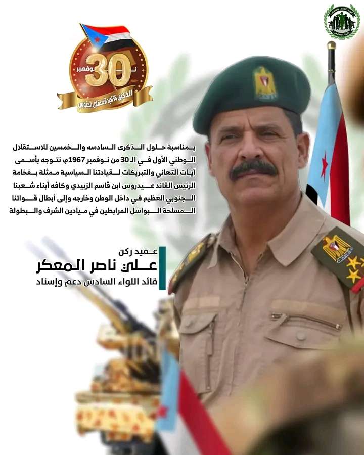 بعثَ العميد ركن /علي ناصر المعكر قائد اللواء السادس دعم واسناد، برقية تهنئة إلى الشعب الجنوبي وقيادته السياسية والعسكريه ممثله بالرئيس القائد /عيدروس الزبيدي بمناسبة الذكرى ال56 لعيد الاستقلال ال30 من نوفمبر المجيد .