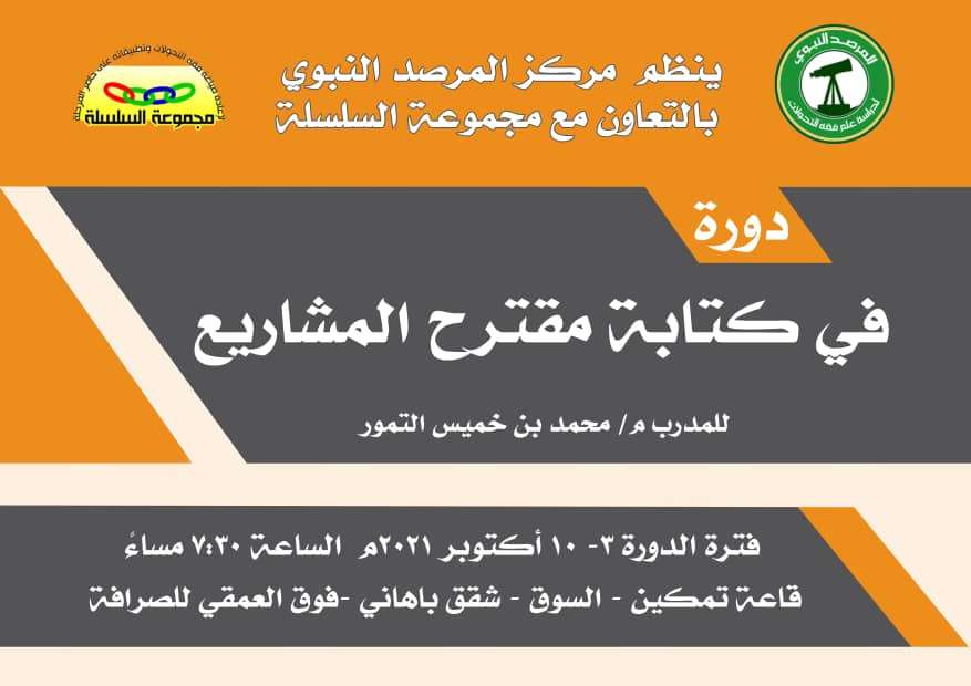 نظم مركز المرصد النبوي لدراسة علم فقه التحولات بالتعاون مع مجموعة السلسلة لمجموعة من المهتمين بدراسة كتابة مقترحات المشاريع التنموية والتي استمرت 25 ساعة تدريبية في الفترة من 3 الى 10 اكتوبر 2021