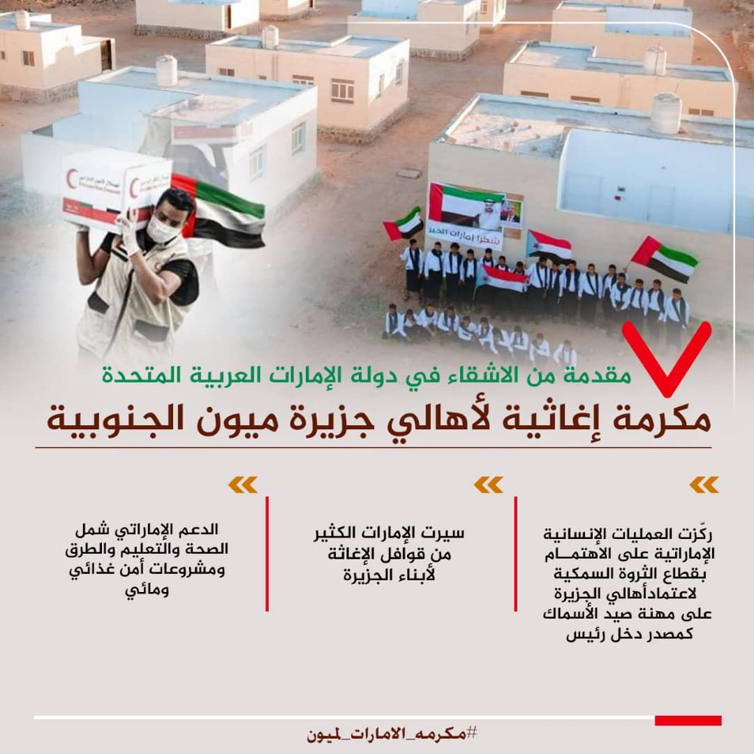 وبهذا العمل الفريد من نوعه تثبت دولة الإمارات مجددا أن مشاريع الحياة قادرة على قهر مشاريع الموت، وقد جاءت المكرمة في ميون بالتزامن مع الهجمات والتهديدات الحوثية والتي استهدفت العديد من المناطق المحررة والموانئ والجزر.