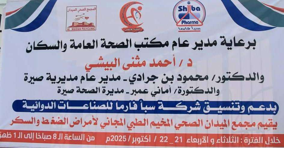 يعلن مكتب الصحة في مديرية صيرة عن إقامة المخيم الطبي المجاني للأمراض المزمنة ( السكر -- الضغط ) في مجمع الميدان الصحي ، خلال الفترة 21--- 22اكتوبر 2025م ، بدعم و تنسيق شركة سبأ فارما للصناعات الدوائية.