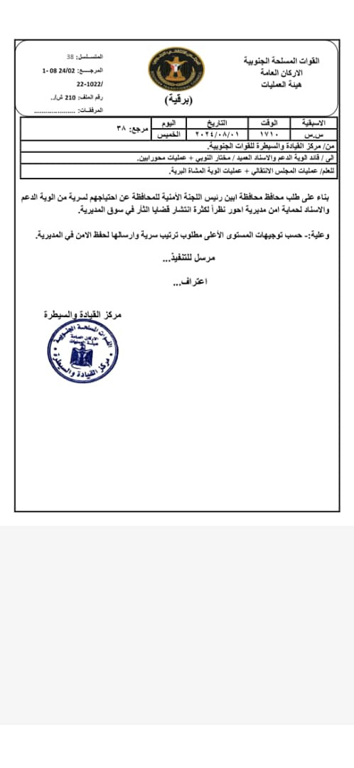 وطالب المجلس الجهات المختصة في محافظة أبين بسرعة تنفيذ التوجيهات العليا، وإرسال قوة عسكرية لدعم الأجهزة الأمنية وتمكينها من فرض الأمن والاستقرار في المديرية، وضمان عودة الحركة الطبيعية في الخط الساحلي الحيوي الرابط بين عدد من المحافظات الجنوبية.