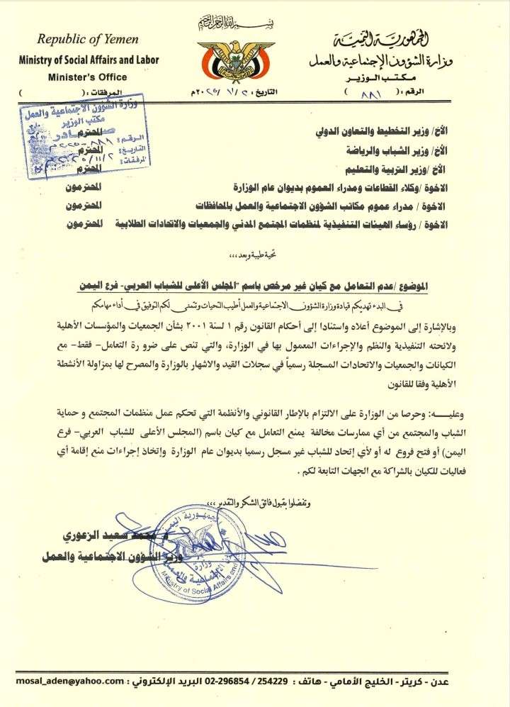 أصدرت وزارة الشؤون الاجتماعية والعمل تعميما رسميا، يحظر التعامل مع كيان غير مرخص يُعرف باسم "المجلس الأعلى للشباب العربي فرع اليمن".