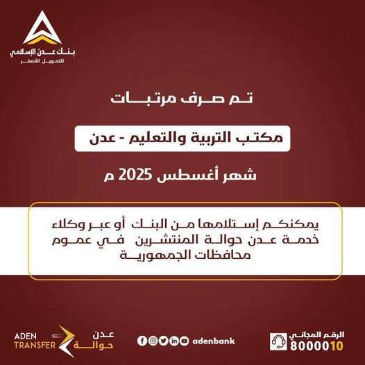 بدء صرف مرتبات تربية عدن لشهر أغسطس 2025