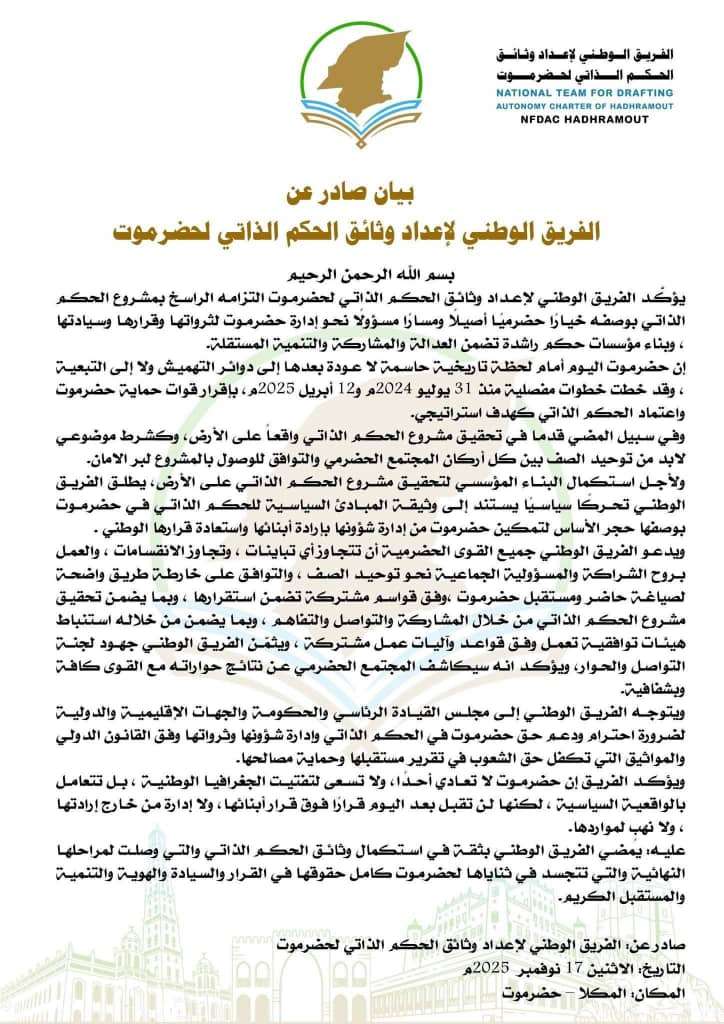 أعلن الفريق الوطني لإعداد وثائق الحكم الذاتي لحضرموت، في بيان رسمي، التزامه الراسخ بالمضي قدمًا في مشروع الحكم الذاتي بوصفه خيارًا حضرميًا أصيلًا، ومسارًا مسؤولًا يهدف إلى تمكين حضرموت من إدارة ثرواتها وقرارها وسيادتها، وبناء مؤسسات حكم راشدة تضمن العدالة والمشاركة والتنمية المستقلة.
