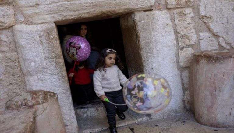 أطفال يحملون بالونات يمرون عبر باب التواضع في كنيسة المهد