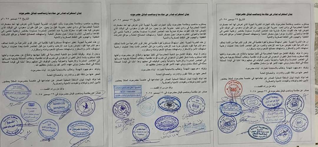 أطلق مقادمة ومناصب قبائل حضرموت بيانا شديد اللهجة ، استنكروا فيه قصف سلاح الجو السعودي لمعسكر النخبة الحضرمية بمديرية غيل بن يمين ، معربين عن استغرابهم من هذه الضربات التي تعيق عمليات ملاحقة العناصر الإرهابية التابعة للقاعدة والحوثيين في المحافظة .