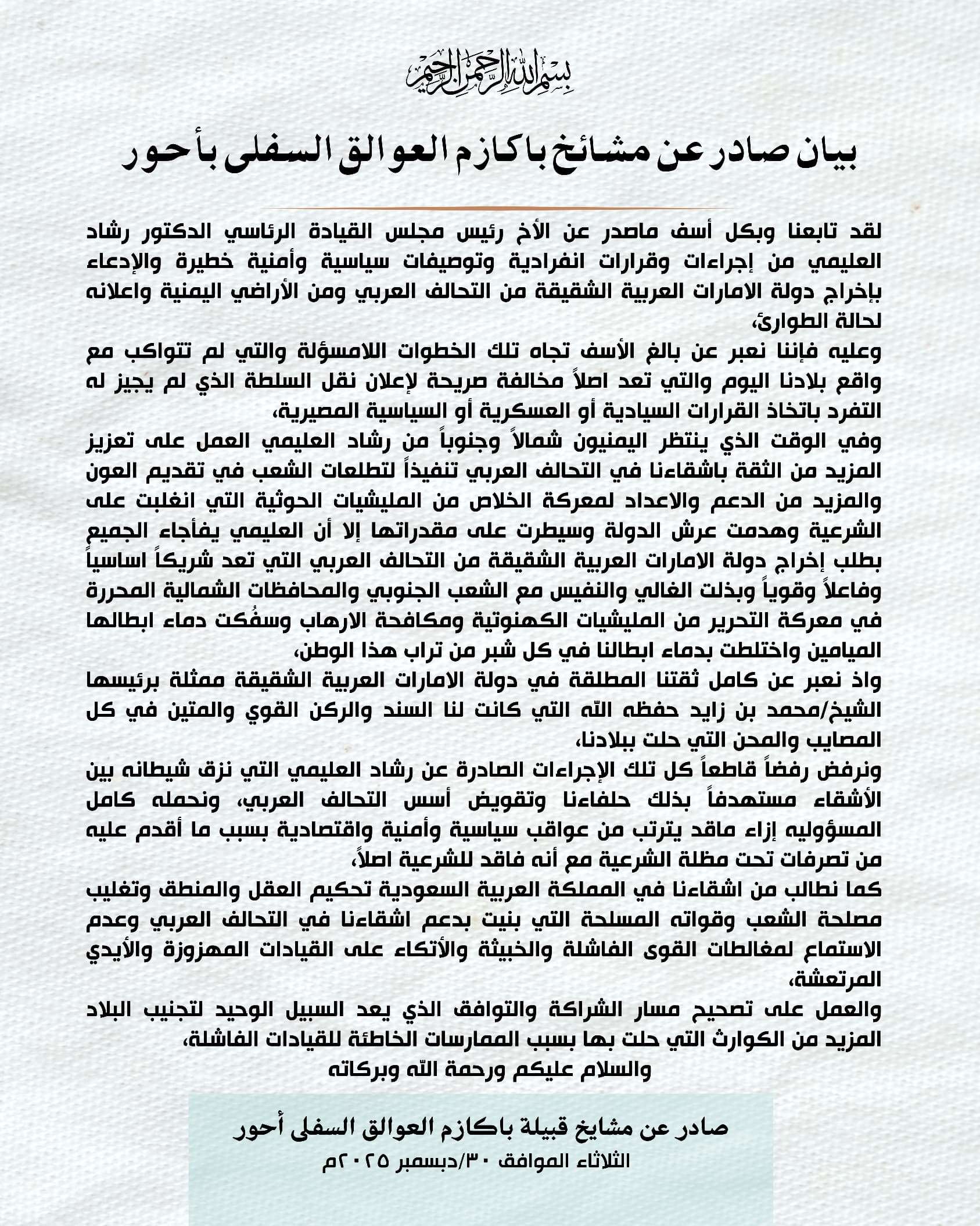 بيان صادر عن مشائخ باكازم العوالق السفلى بأحور