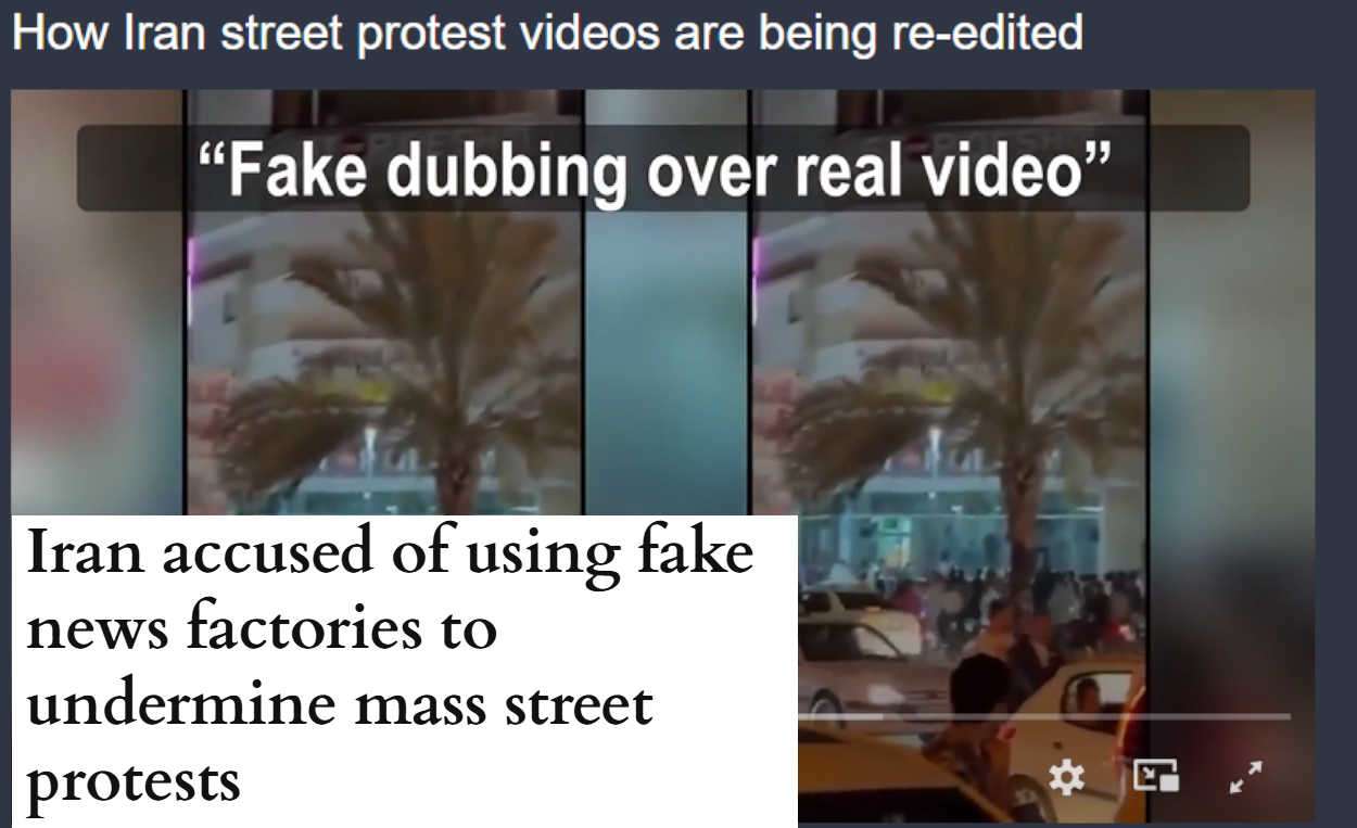 ومع تراجع قوات حرس النظام وعجزها عن قمع المتظاهرين في الميادين، لجأت الدولة إلى “حرب المعلومات”. وأوضحت الصحيفة أن النظام يستخدم عملاء وممثلين تابعين للدولة لاختراق صفوف المحتجين، بالتوازي مع نشر مقاطع فيديو مزيفة بتقنية التزييف العميق على الإنترنت لزرع الفتنة وإضعاف الانتفاضة.