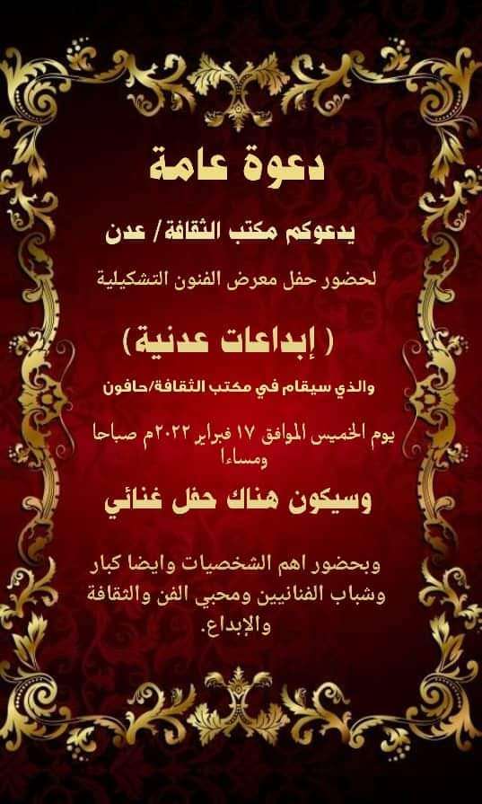 يقيم مكتب الثقافة بمحافظة عدن يوم غدا الخميس الموافق ١٧ فبراير من ٢٠٢٢ م حفل معرض الفنون التشكيلية والذي يقيمها تحت شعار ” ابداعات عدنية ” .