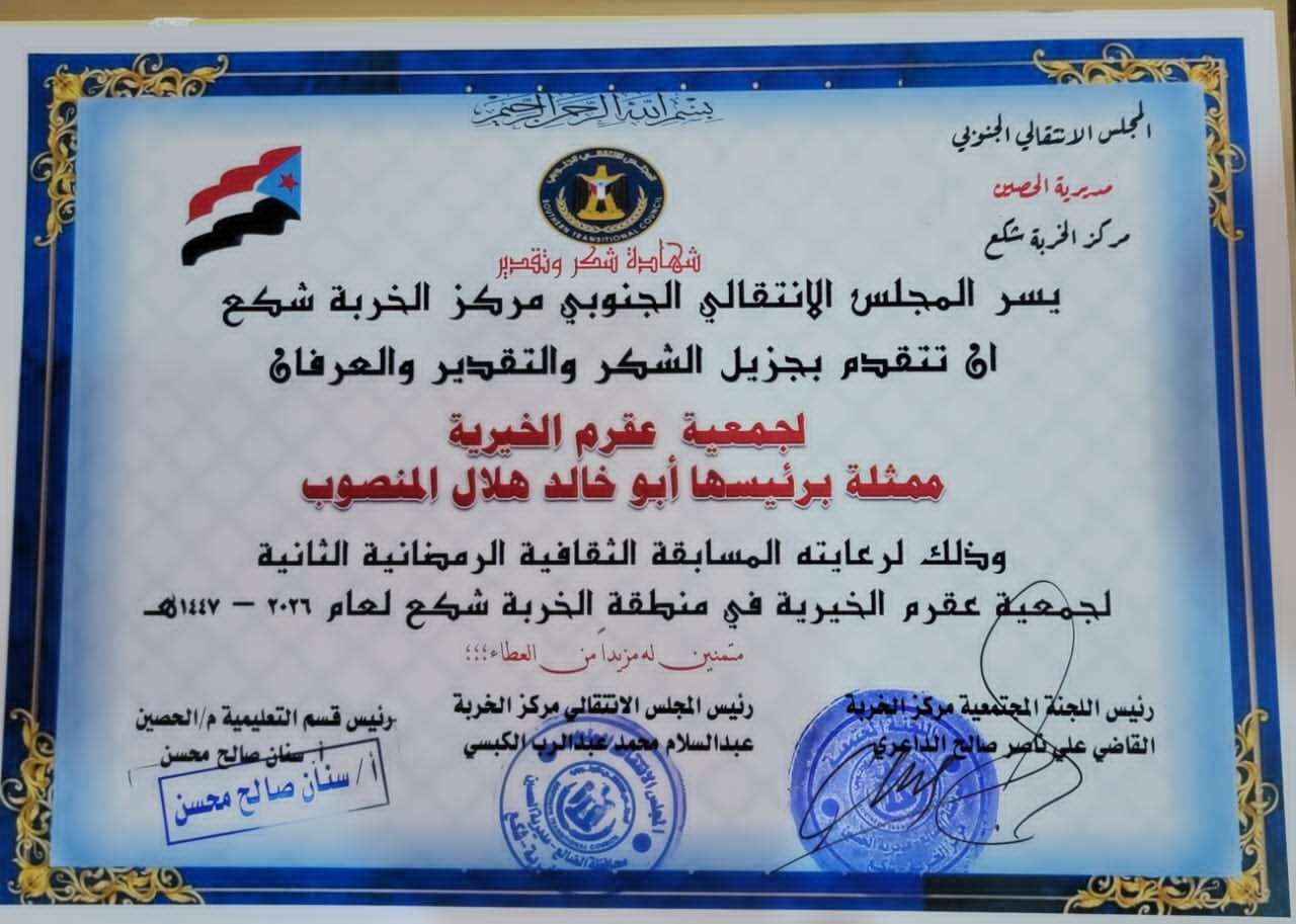 وأشاد المجلس الانتقالي في مركز الخربة شكع بالدور المجتمعي الذي تقوم به جمعية عقرم الخيرية بقيادة الشيخ أبو خالد المنصوب، مؤكداً أن مثل هذه المبادرات تعكس روح التعاون والتكافل المجتمعي، وتسهم في دعم الأنشطة الهادفة التي تخدم المجتمع وتنمي الوعي الثقافي.
