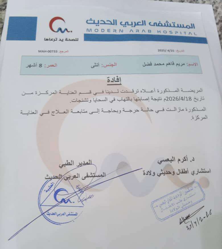 وبحسب النداء، فإن الطفلة “مريم”، البالغة من العمر 8 أشهر، خضعت خلال الفترة الماضية لمتابعة طبية مستمرة، متنقلة بين عدد من الأطباء، قبل أن تتفاقم حالتها الصحية وتدخل العناية المركزة في أحد المستشفيات، وسط قلق متزايد على حياتها.