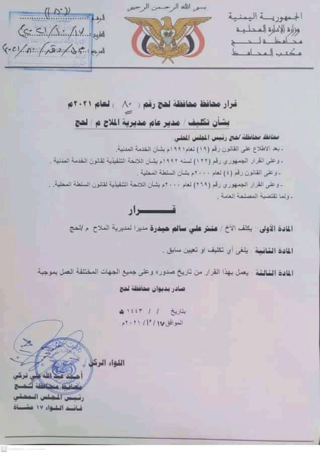 المادة الأولى: يكلف الأخ / عنتر علي سالم حيدرة المغربي الحوشبي مديرا لمديرية الملاح.