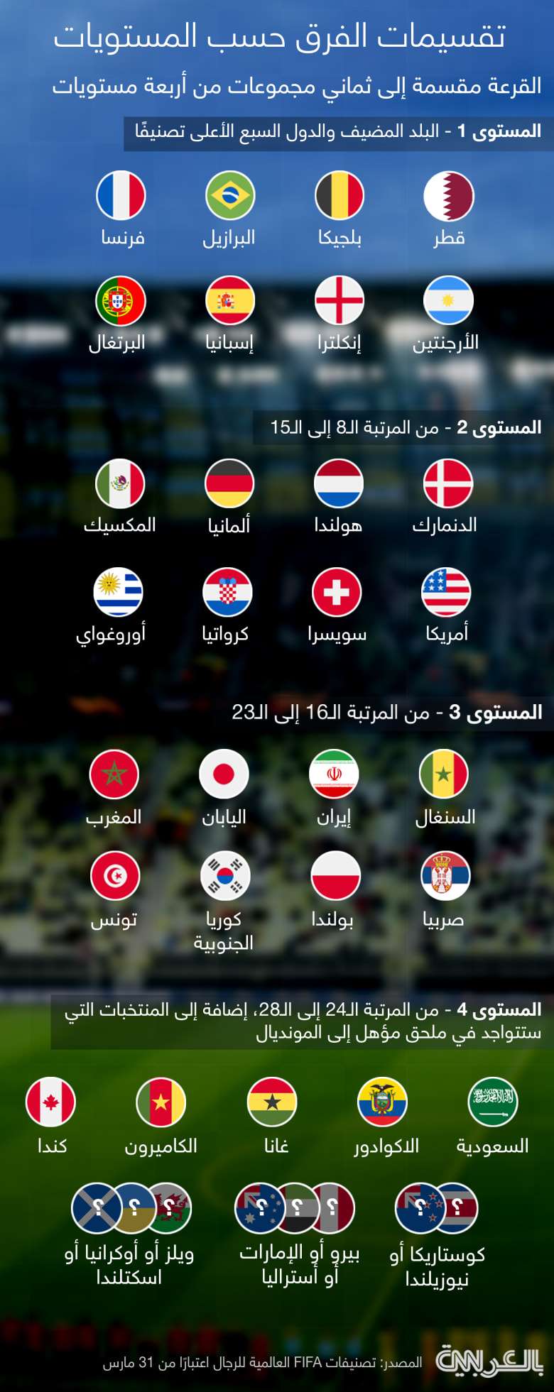 أما المنتخبات التي ستلعب الملحق فستقع في التصنيف الرابع بصرف النظر عن ترتيبها في تصنيف 31 مارس/أذار الماضي.