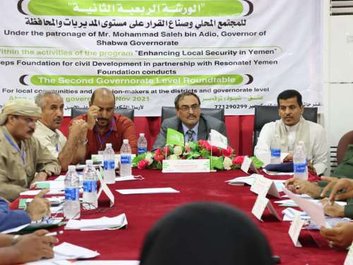 نظمت مؤسسة خطوات للتنمية اليوم في عتق بمحافظة شبوة الورشة الربعية الثانية "للمجتمع المحلي وصناع القرار وذلك في اطار أنشطة برنامج "تعزيز الامن على المستوى المحلي في اليمن" والذي تنفذه بالشراكة مع مؤسسة رنين اليمن .