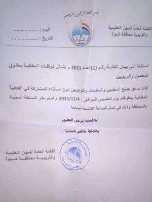 أعلنت نقابة المهن التعليمية في محافظة شبوة، تنظيم وقفة احتجاجية لأعضائها أمام مقر السلطة الإخوانية في مديرية عتق، صباح غد الخميس، للمطالبة بمنح المعملين حقوقهم المشروعة.