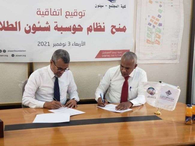 في ظل الاهتمام الخاص التي توليه قيادة كلية المجتمع بسيؤن ممثلة بالدكتور فهمي فرار في خلق شراكات مع منظمات المجتمع المدني للإسهام في النهوض بالتعليم الجامعي وتمكين الشباب عبر برامج تنموية تسهم في خلق فرص عمل للشباب والفتيات في مختلف المجالات تم صباح أمس بكلية المجتمع بسيؤن توقيع اتفاقية شراكة بين مؤسسة العون للتنميه والذي وقعها عن المؤسسه المدير التنفيذي للمؤسسه الدكتور / عبداللاه بن عثمان ووقعها عن كلية المجتمع بسيؤن عميد الكليه الدكتور /فهمي شعبان فراره وقد تضمنت الاتفاقية( منح نظام حوسبة شؤون الطلاب ) في ظل الشراكه المجتمعيه.