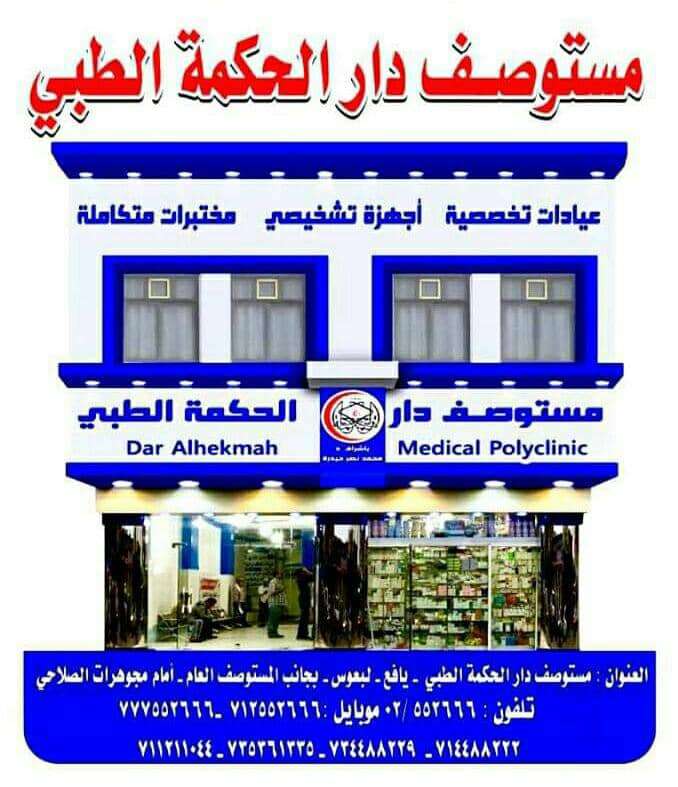 مستوصف دار الحكمة الطبي يافع لبعوس سوق 14 أكتوبر الشارع العام امام مجوهرات الصلاحي.