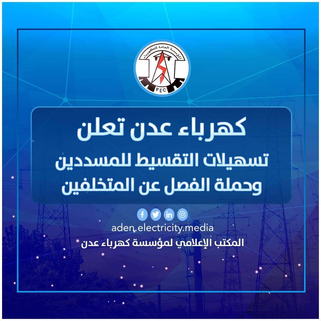 كهرباء عدن تعلن تسهيلات التقسيط للمسددين وحملة الفصل عن المتخلفين