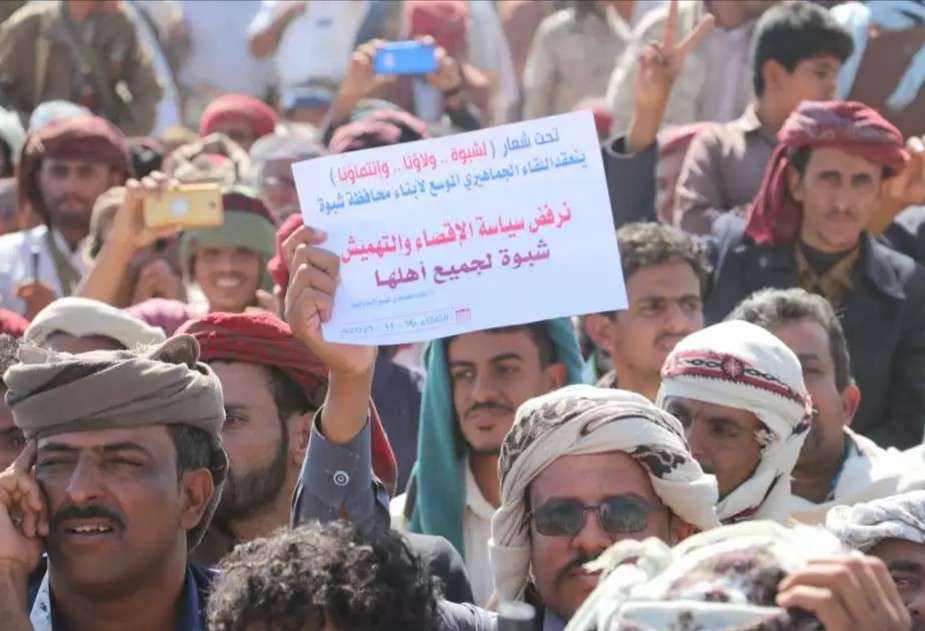 وشارك الالاف من ابناء ووجهاء قبائل شبوة في اللقاء، الذي دعا له النائب في البرلمان والزعيم القبلي، عوض محمد بن الوزير العولقي، وطالب فيه بإقالة سلطة شبوة والتحقيق معها ومحاسبتها والمتورطين "في خيانة الارض والعرض ودماء الشهداء"، بتسليم مديريات بيحان غرب شبوة لميليشيا الحوثي الانقلابية دون قتال .