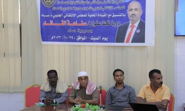 في إطار اهتمام وحرص إدارة الشباب والطلاب بالهيئة التنفيذية المساعدة لشؤون مديريات وادي وصحراء حضرموت لتأهيل الشباب ليكونوا جزءا فاعلا بالمجتمع الحضرمي نظمت إدارة الشباب والطلاب بالهيئة التنفيذية المساعدة للمجلس الانتقالي الجنوبي لشؤون مديريات وادي وصحراء حضرموت بالتنسيق مع القيادة المحلية للمجلس الانتقالي الجنوبي بمديرية/ ساه صباح اليوم السبت 29/ أكتوبر/ دورة تدريبه تحت عنوان \”صناعة القائد\”.