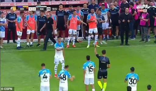 أشهر الحكم فاكوندو تيو عشر بطاقات حمراء في مباراة كأس الأبطال (السوبر) لكرة القدم في الأرجنتين بعد أن تسبب كارلوس ألكاراز لاعب وسط ريسنج في مشاجرة أمام مشجعي بوكا جونيورز أثناء الاحتفال بهدف الفوز 2-1 الليلة الماضية.