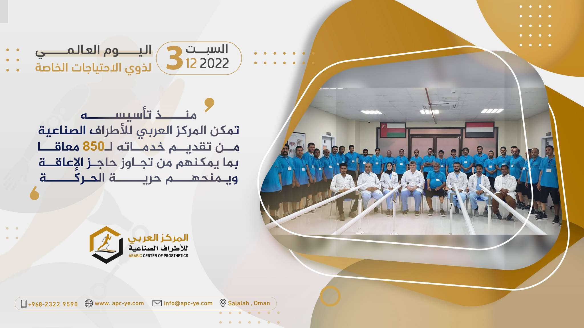 نظم المركز العربي للأطراف الصناعية بسلطنة عمان مباراة رياضية لمبتوري الأطراف من جرحى الحرب في اليمن احتفاءًا باليوم العالمي لذوي الاحتياجات الخاصة الثالث من ديسمبر.