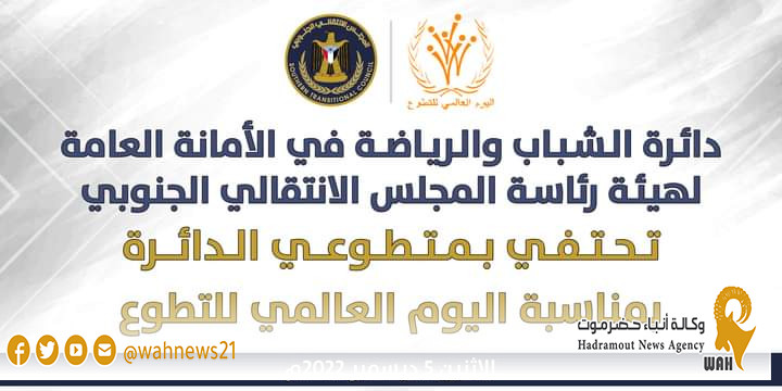 كرّم نائب الأمين العام لهيئة رئاسة المجلس الانتقالي الجنوبي الاستاذ فضل محمد الجعدي، اليوم الإثنين، طاقم المتطوعين في دائرة الشباب والرياضة بالأمانة العامة، بحضور نائب رئيس الدائرة الاستاذ الكريحي كنعان، بالتزامن مع اليوم العالمي للتطوع الذي يحتفل به العالم في الخامس من ديسمبر في كل عام.