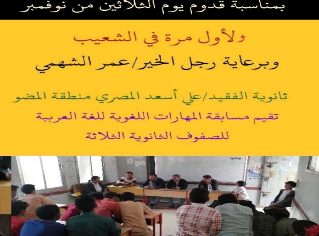 أقيم صباح اليوم الخميس الموافق 25 نوفمبر 2021م. وبالتزامن مع حلول عيد الاستقلال الجنوبي ال 30 من نوفمبر مسابقة من النوع الفريد والمتميز في المهارات اللغوية للغة للعربية لنخبة من طلاب ثانوية الفقيد/ علي اسعد المصري منطقة المضو مديرية الشعيب..