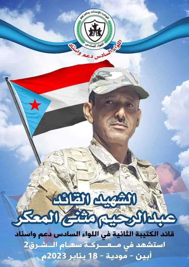 بعث العميد ركن علي ناصر المعكر قائد اللواء السادس دعم واسناد برقيه عزاء ومواساة لاسرة الشهداء علئ راسهم الشهيدالقائد عبدالرحيم مثنئ محمد المعكر قائد الكتيبه الثانيه واثنين من مرافقيه بعمليه غادره عبوة ناسفه استهدفت الطقم الخاص بهم في طريق وادي عومران ابين