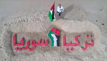 فلسطيني يرسم لوحة على رمال شاطئ غزة للتضامن مع تركيا وسوريا
