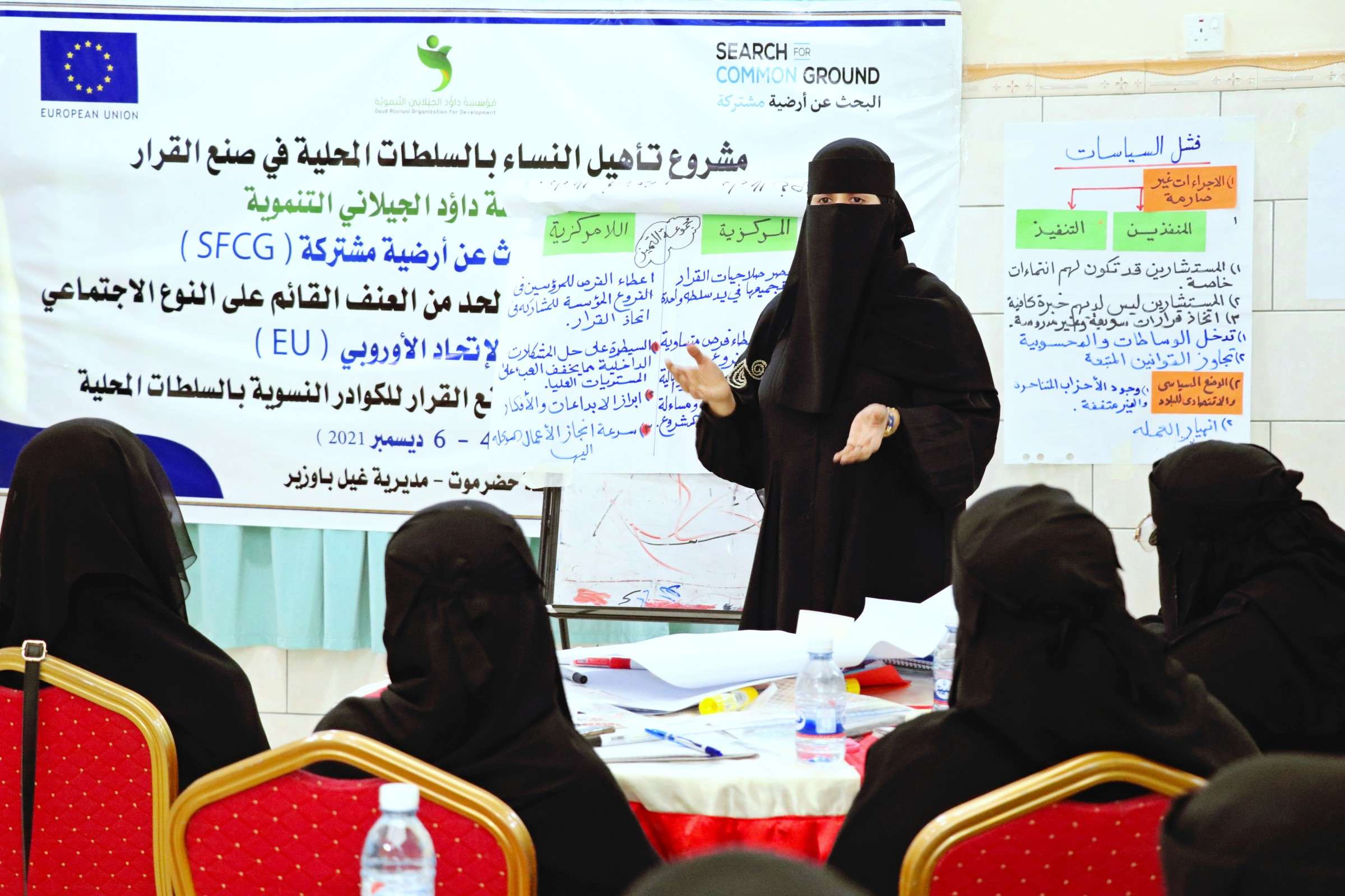 اختتمت صباح اليوم في غيل باوزير ورشة عمل حول الحكم الرشيد وصنع القرار للكوادر النسوية بالسلطات المحلية تنفذها مؤسسة داؤد الجيلاني التنموية بدعم منظمة البحث عن أرضية مشتركة ( SFCG ) ضمن مشروع دعم حقوق المرأة والحد من العنف القائم على النوع الاجتماعي الممول من الاتحاد الأوروبي ( EU ) .