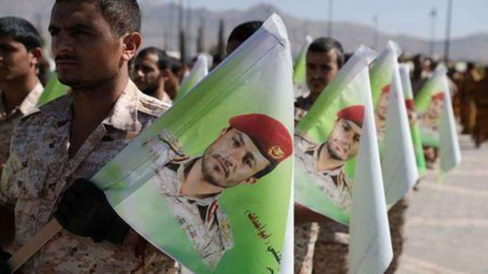 جنود حوثيون يحملون أعلاما عليها صورة لقائد حوثي