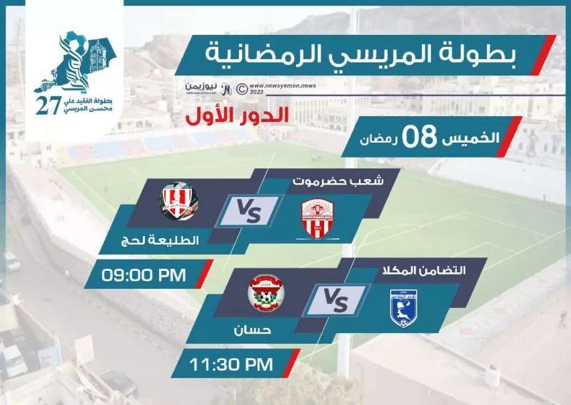 تتواصل مساء اليوم الخميس، مواجهات الدور الأول من بطولة كأس المريسي الرمضانية بنسختها الـ27 والتي تقام برعاية المجلس الانتقالي الجنوبي، وبإشراف مكتب الشباب والرياضة بعدن وبتنظيم إتحاد كرة القدم فرع عدن، بمشاركة 24 فريقا من عدد من المحافظات إلى جانب أندية العاصمة عدن، وتقام جميع مبارياتها على ملعب الحبيشي.