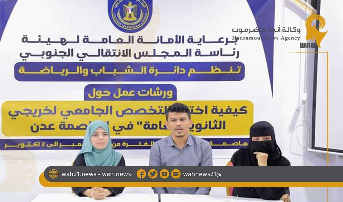 دشنت دائرة الشباب والرياضة في المجلس الانتقالي الجنوبي ورشات عمل حول كيفية إختيار التخصص الجامعي لطلاب الثانوية العامة اليوم الأربعاء الموافق 27 سبتمبر في العاصمة عدن