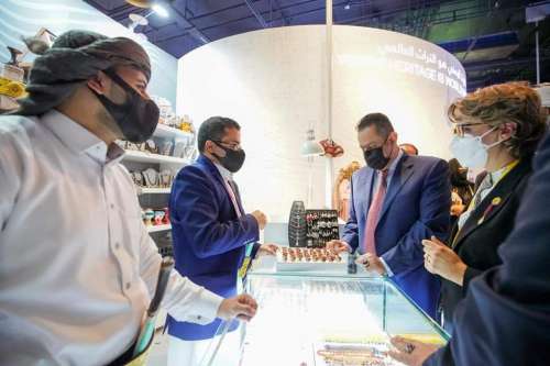 حيث تفقد رئيس الوزراء ومرافقوه جناح اليمن " أحفاد سبأ"، وما يحويه من استدعاء للابداعات التي ابتكرها الأسلاف في العصور القديمة، في واحدة من أقدم الحضارات في العالم.