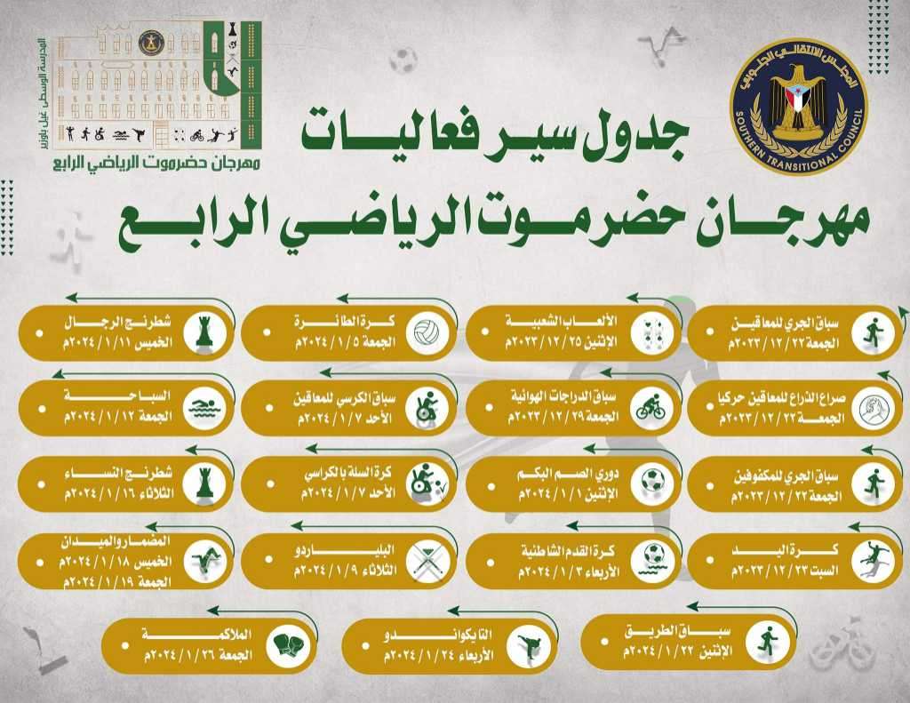 تنطلق فعاليات مهرجان حضرموت الرياضي الرابع ، عصر اليوم الجمعة في ملعب الفقيد بارادم بالمكلا ، بحفل فني واستعراضي بهيج.