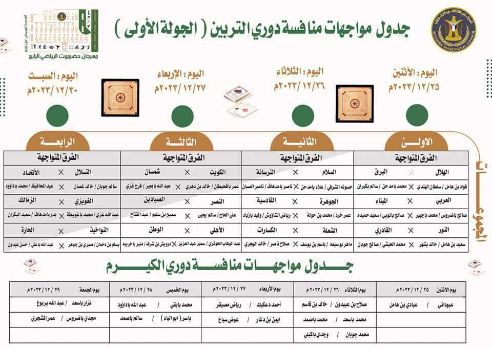 ويخوض مساء غدًا في افتتاح دوري لعبة الكيرم المشاركين عبوداني يواجه نظيره عبادي بن هامل، وبمشاركة 20 مشارك بنظام خروج المغلوب من مواجهة واحدة تستمر المواجهات لمدة خمسة أيام.