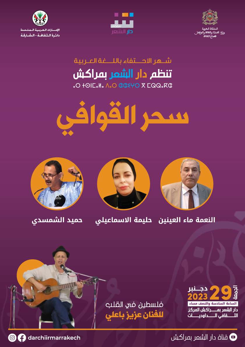 تنظم دار الشعر بمراكش، يوم الجمعة 29 ديسمبر على الساعة السادسة والنصف مساء، فقرة جديدة من برنامج "سحر القوافي" بفضاء الدار الكائن بالمركز الثقافي الداوديات، بمشاركة الشعراء: حميد الشمسدي وحليمة الاسماعيلي والنعمة علي ماء العينين، ويقدم الفنان عزيز باعلي بعضا من أغانيه الجديدة من ألبومه الجديد "فلسطين في القلب". وخصصت دار الشعر بمراكش، شهر دجنبر، للاحتفاء باليوم العالمي للغة العربية، ابتداء من فقرة أصوات معاصرة والتي احتفت بتجارب شعرية شبابية، وملتقى المعتمد الدولي للشعر، هذه البرمجة الجديدة والتي تسعى لفتح حوار بين ثقافات الضفتين، وانتهاء بفقرة سحر القوافي والتي تستضيف شعراء القصيدة العمودية في المغرب.